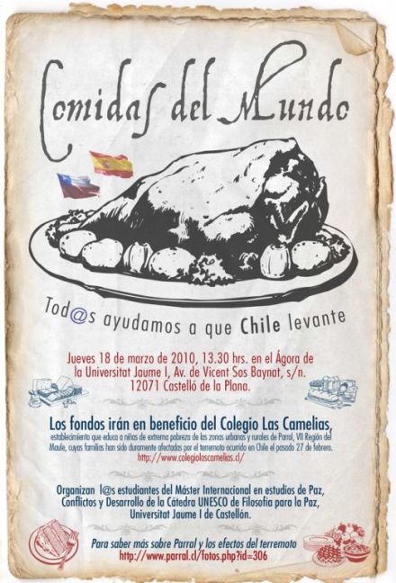 Frente a los devastadores efectos del terremoto ocurrido este pasado 27 de febrero en Chile, en las regiones VII y VIII, las y los estudiantes del Máster Internacional en Estudios de Paz, de la UJI organizan el evento «Comidas del Mundo: Tod ayudamos a que Chile se levante».